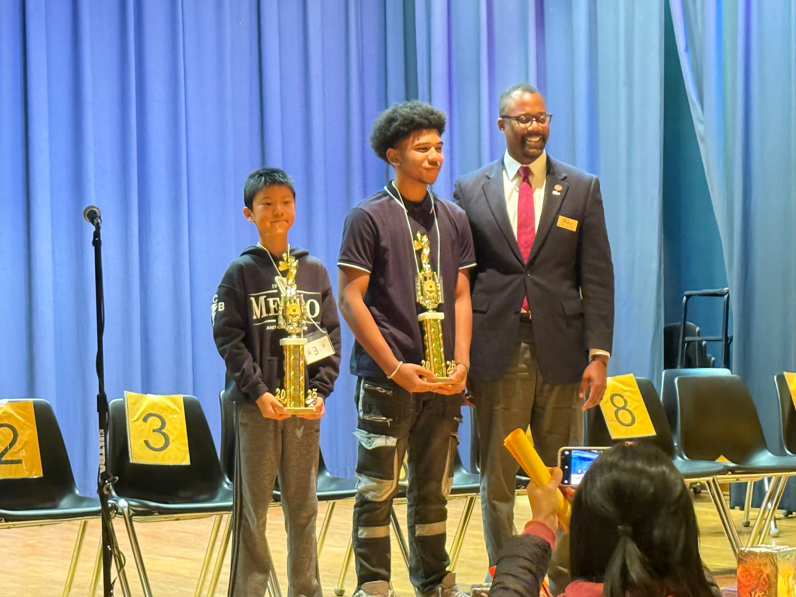 Peter Bao and Domani Hill pose for pictures holding their trophies at the 2025 Richmond County spelling bee. Staff photo by Drew Wall.