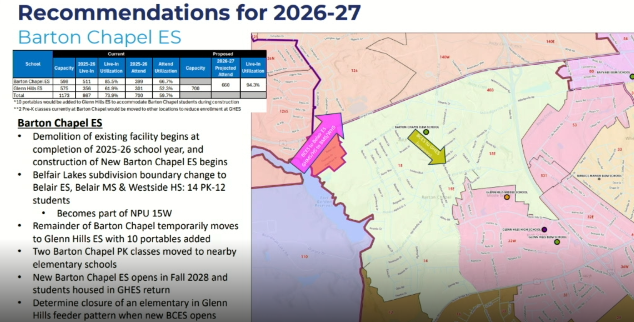 Richter also outlined a proposal involving Barton Chapel Elementary School, which would be demolished following the completion of the 2025–2026 school year. Students from Barton Chapel would be temporarily reassigned to Glenn Hills Elementary while construction begins on a new Barton Chapel school, which is projected to open in fall 2028.