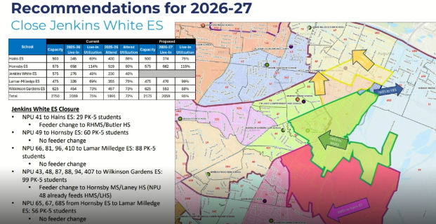 Among the recommendations discussed was the closure of Jenkins-White Elementary School. Doing so would likely reassign students to nearby schools through a series of feeder pattern changes.