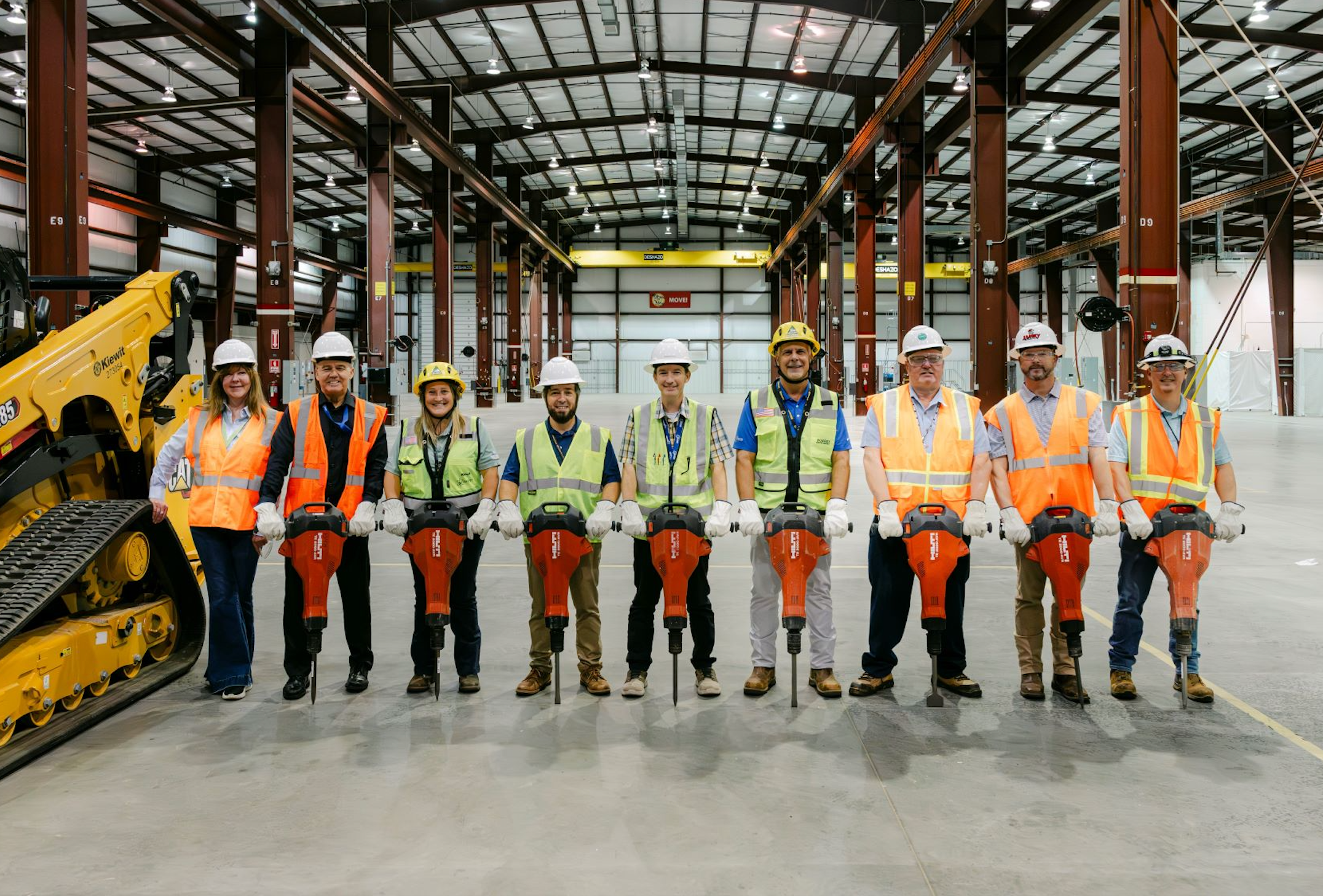 SRNS identified subcontractor Kiewit to kick off the early construction scope for the High-Fidelity Training and Operations Center (HFTOC) subproject. Representatives from SRNS and Kiewit are pictured with jackhammers inside the existing HFTOC structure as the initial scope will include replacement of the concrete flooring and other external and internal building modifications. Photo courtesy of Savannah River Site.