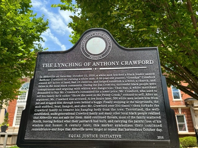 Intermingled amongst all the reminders of the Confederacy is a solitary marker dedicated to the memory of Anthony Crawford, who was lynched in front of the courthouse in 1916.