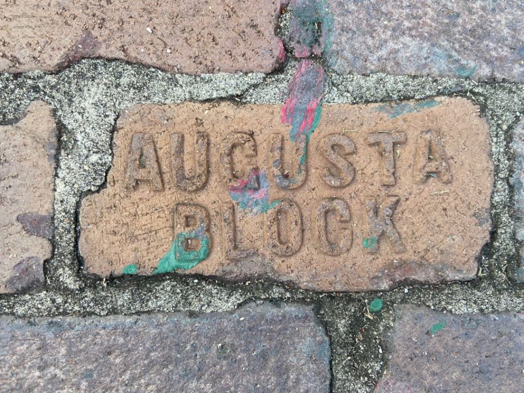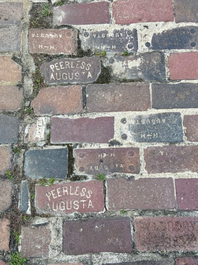 After the concert, Bret and I walked down Main Street, which was blocked off in preparation for Oct. 2’s Oktoberfest. One thing I immediately noticed as we walked the square were the bricks. Some of them were Augusta Block and others were stamped Peerless Augusta. The Augusta Blocks I’ve seen before, but I’ve never seen the Peerless ones. I’ll probably be giving Erick Montgomery with Historic Augusta a call on Monday.