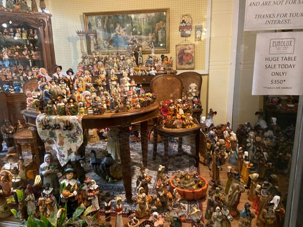 The shop had hundreds of Thanksgiving pilgrims lining the storefront, and inside there were massive desks, wardrobes, dining room tables and chairs – all made out of wood. The desk that drew my husband was filled with hidden compartments and drawers, but the feature that interested him the most is that it looked like a stage.