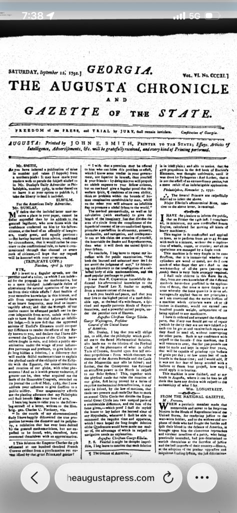 In 1792, the first year for which copies of the Augusta Chronicle remain available, John E. Smith was editor, and the paper carried the motto “Freedom of the Press, and Trial by Jury, shall remain inviolable.” It cited those two rights not to the brand, spanking new U.S. Constitution but the Georgia state Constitution.