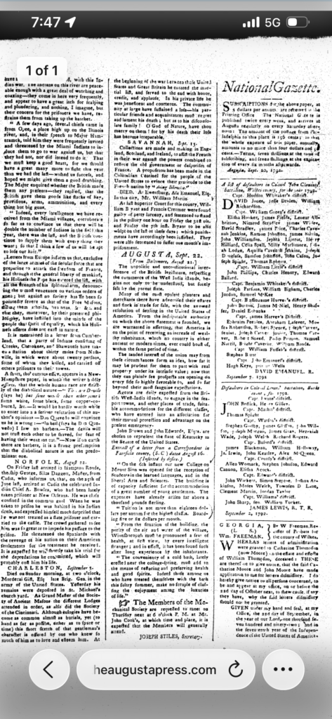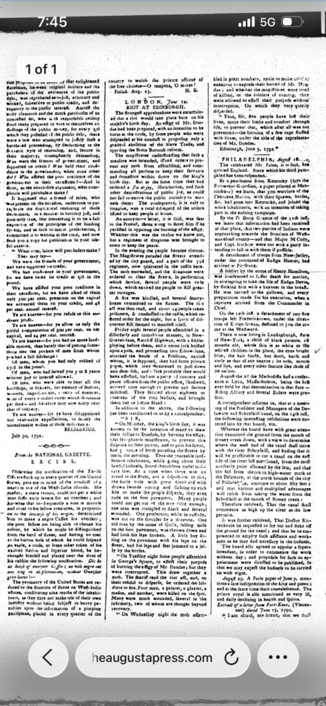 That article continues on page two, and another article from the National Gazette follows. Page 2 also reports on a riot in Edinburgh. It is the closest to a modern day newspaper article since it deals with news — though news that is more than three months old. The rioters burned an effigy of Henry Dundas, a Scottish politician who was serving as the British Home Secretary. Dundas had just amended the legislation to slow down the end slavery in the British empire. His reasons for wanting to slow the abolition of the slave trad were complex – and unpopular with those who preferred a quicker death to the “peculiar institution,” as historians refer to it.