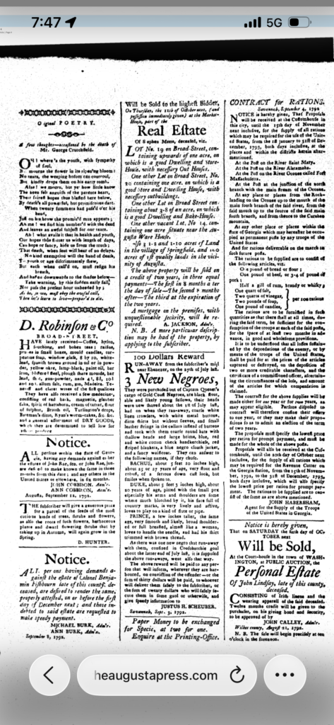 Page 4 carried a poem, very common in eighteenth and nineteenth century newspapers, and ads from local merchants and others. D. Robinson & So, a Broad Street dry goods store, announced it had received coffee, a variety of teas, raisins, “prunes in small boxes,” candles, soap, window glass, and other goods, including a variety of alcoholic libations and medicines. A runaway slave ad sought three men, who who was a talented flute player and another who could weld a needle “almost like a woman.” The printing office also offered to exchange paper money for specie at a rate of two-to-one. The paper also announced an estate sale at Washington, Ga., for the estate of John Lindsay, deceased. It included Irish linens and