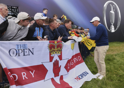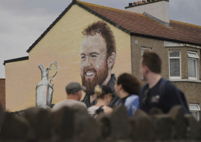 A mural of Shane Lowry holding aloft the claret jug adorns the side wall of a house just across the...