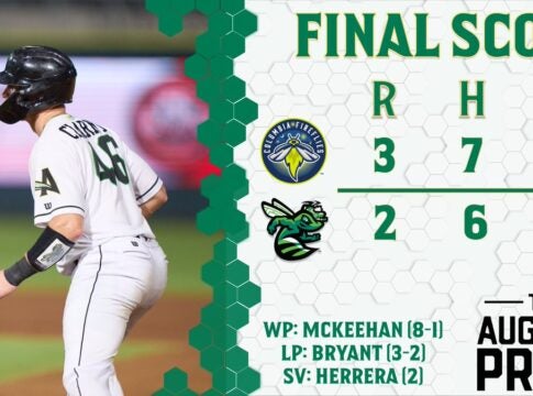 Augusta, Columbia took scoreless game to extra innings, and Fireflies win 3-2.