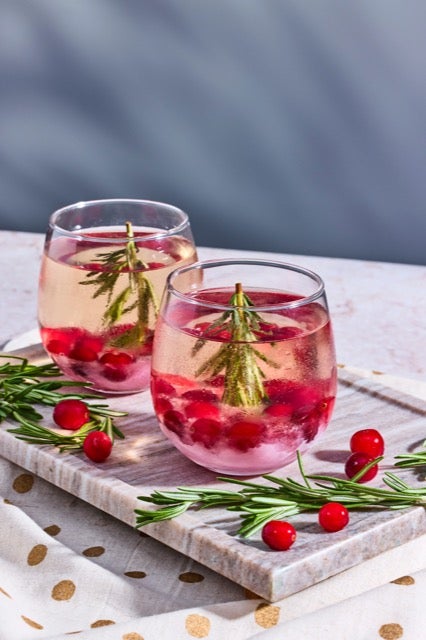Make a fun and easy drink. Add a sprig of rosemary and a few cranberries into a glass and add an inch or two of water. Freeze and then pour your beverage of choice over the colorful base.