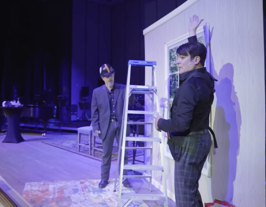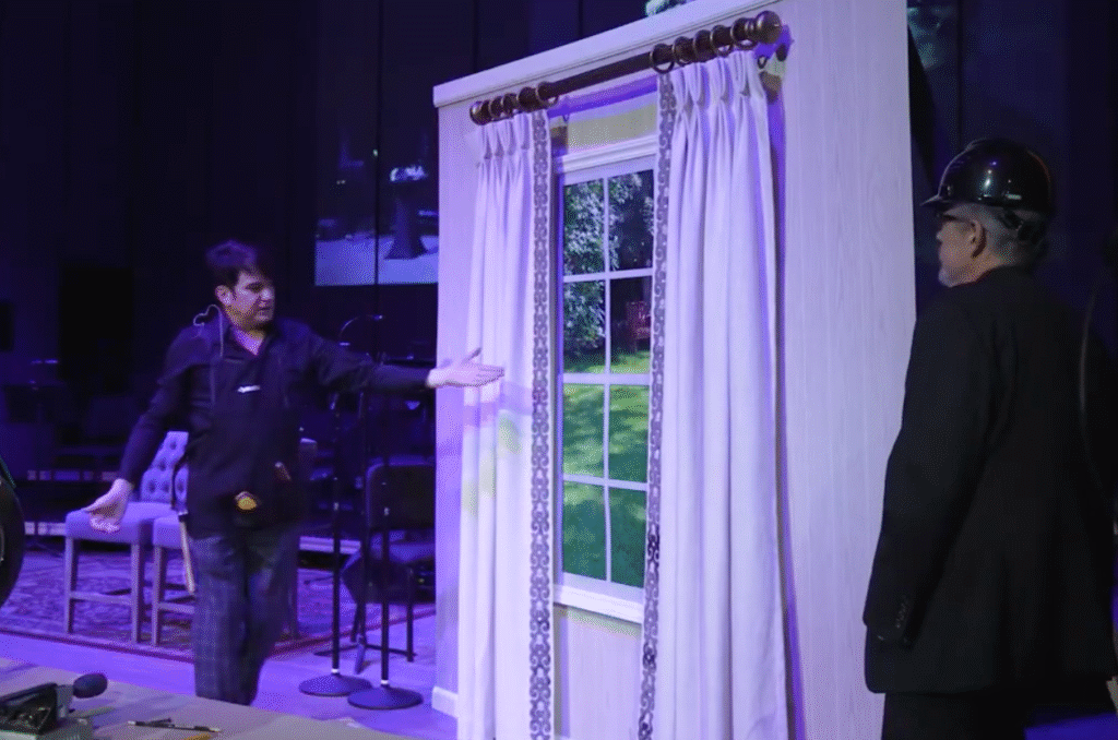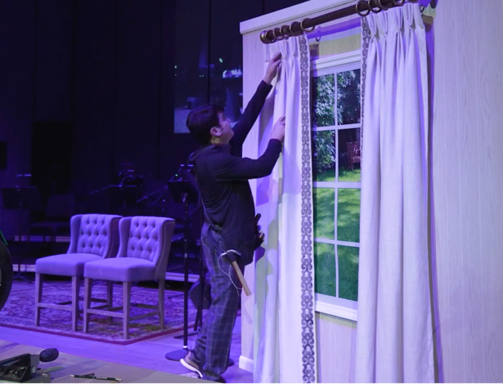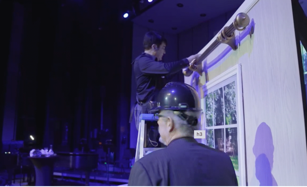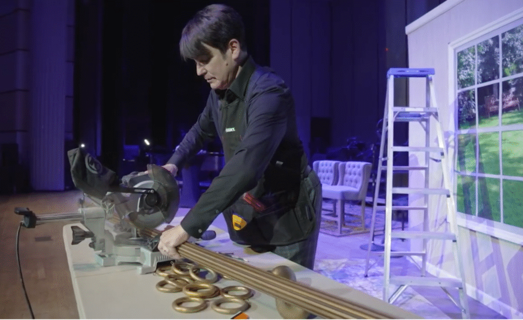 During the TV show segment I discussed the dynamics of how to measure and install a window treatment as I climbed a ladder onstage to give a visual demonstration. I installed a pair of drapery panels on a wall with a window that I had built for the stage.