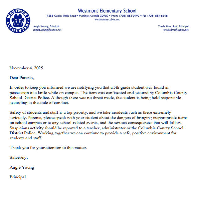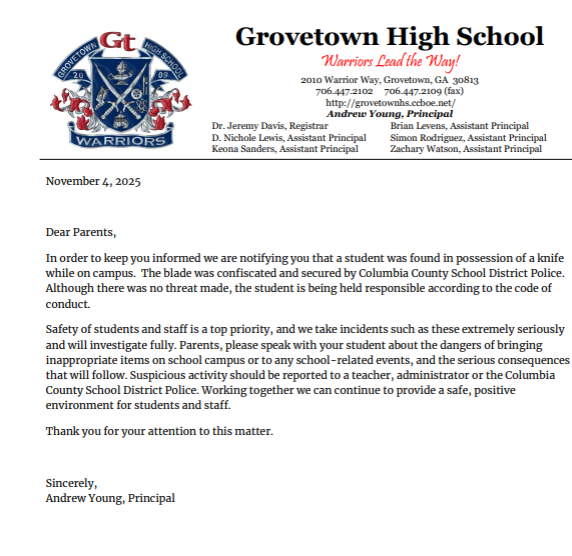 At Grovetown High, a student was found with a knife on campus. “The blade was confiscated and secured by Columbia County School District Police,” Andrew Young wrote. “Although there was no threat made, the student is being held responsible according to the code of conduct.”