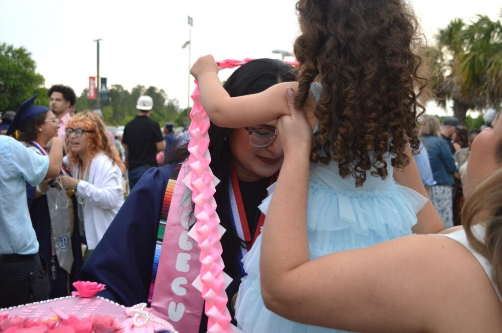 Haily Pineda is gifted a graduation lei by her niece after the ceremony. Staff photo by Erin Weeks.