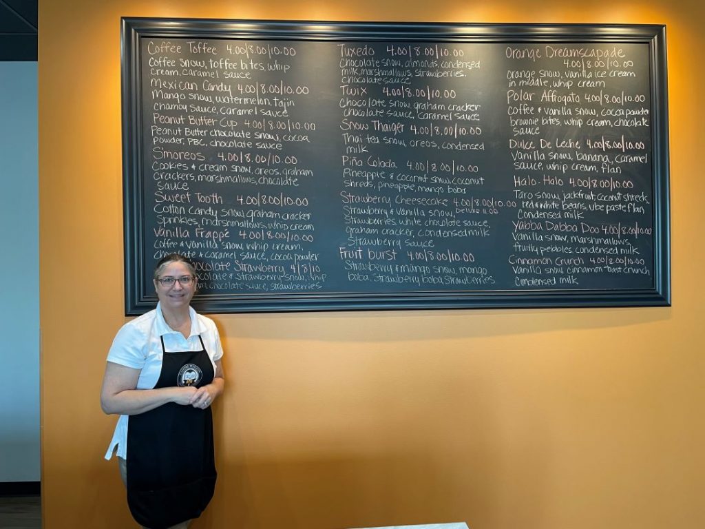 Creativity is obviously paramount to the shop’s business model, and so franchises are permitted to create their own shaved ice dishes to add to the standard menu. Among the menu items unique to the Evans include the vanilla frappe and the fruit burst, which consists of strawberry and mango snow and boba.